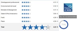 Les meilleures notes dépassent 4,3 dans plusieurs domaines : le développement professionnel, l’environnement de travail, la motivation et le management. Finalement, le taux de recommandations d’Almavia CX, par nos salariés, atteint 71 %.